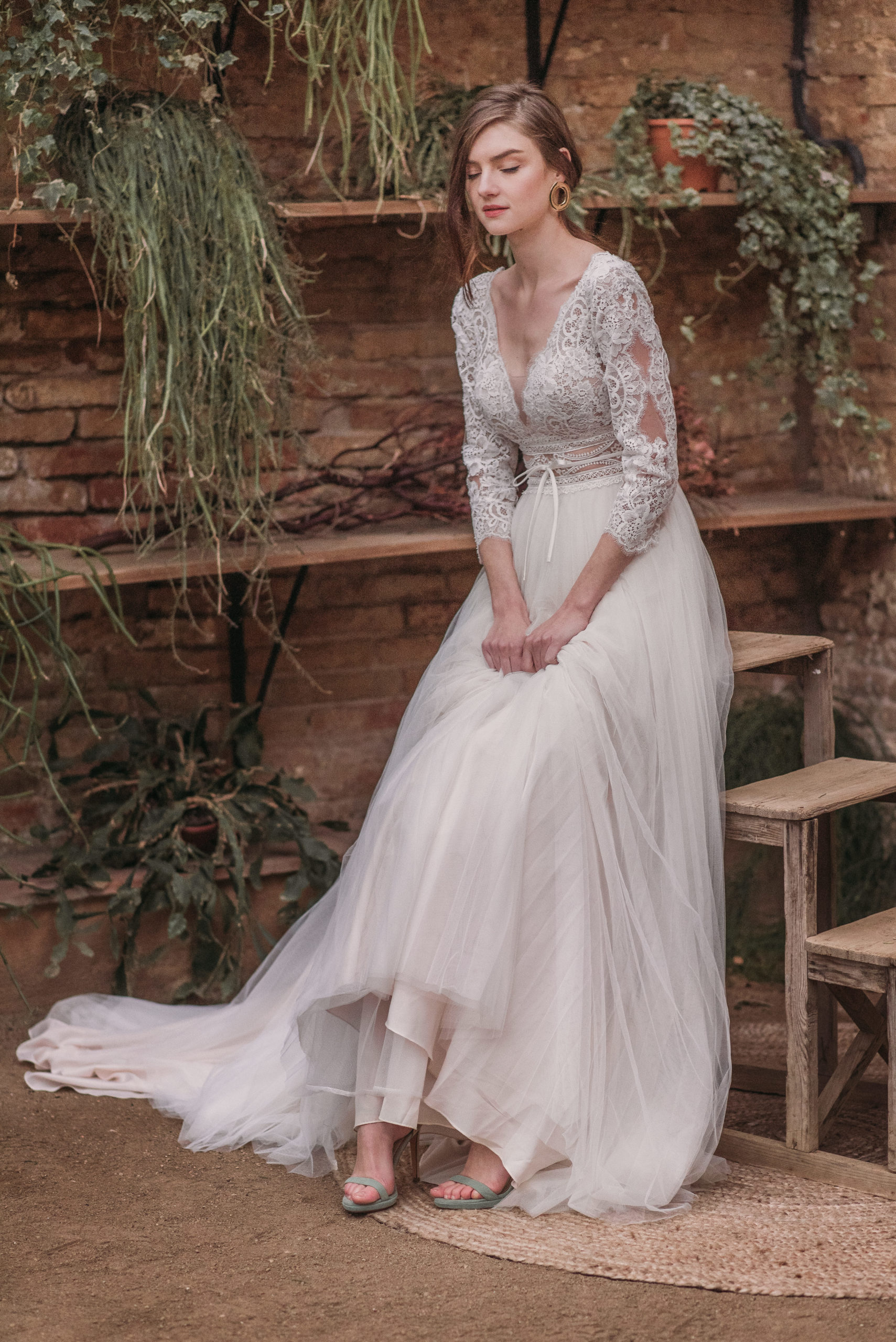 Ein langärmliges fließendes Brautkleid mit einem Touch Vintage.
