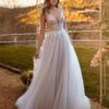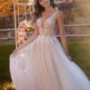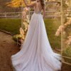 A-Linien-Kleid mit  funkelnden Pailletten und floraler Spitze dazu ein geraffter Rock aus weichem Tüll.