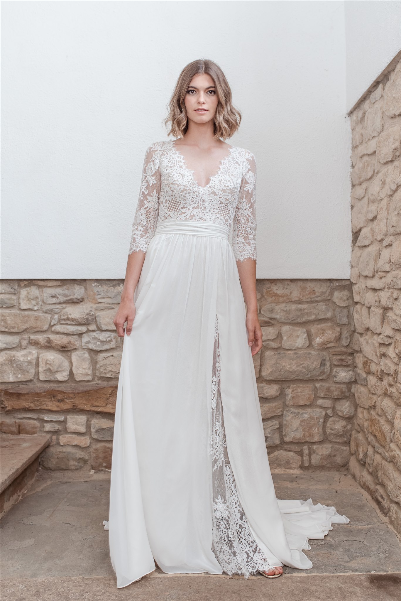 Das Oberteil ist komplett aus zarter Spitze dazu ein luftiger Chiffonrock der mit Schlitz aus Spitze kombiniert werden kann. Romantisch und trotzdem aufregend.