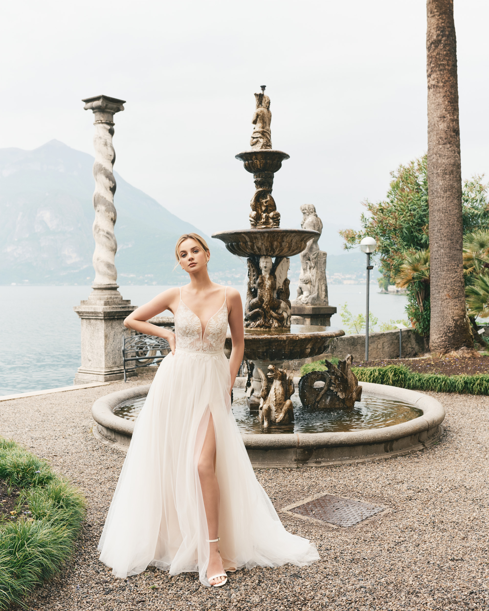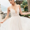 Fließendes Brautkleid aus Soft-Tüll mit feiner Spitze und Beinschlitz.