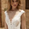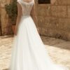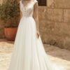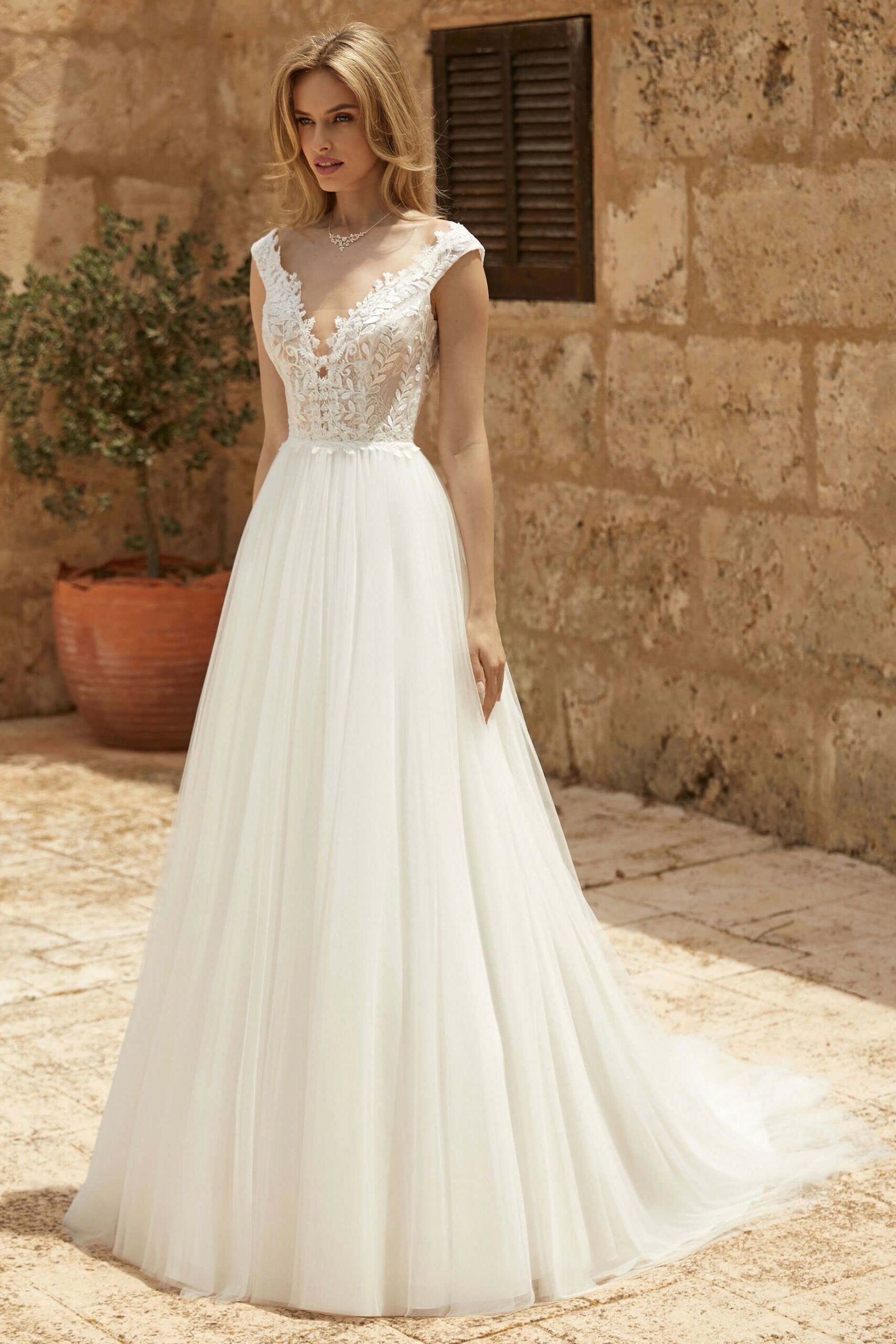 A-Linie aus Tüll mit Spitze und V-Ausschnitt vorne, der Rücken hat einen eleganten U-Boot Ausschnitt.