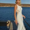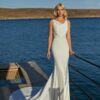 Nisha hat einen eleganten Wasserfallausschnitt und zarte Spitze in der Taille, die diesem raffinierten Brautkleid einen Hauch von Romantik verleihen. Schmeichelnde Illusionsausschnitte an den Seiten führen zu einem verführerischen offenen Rücken.