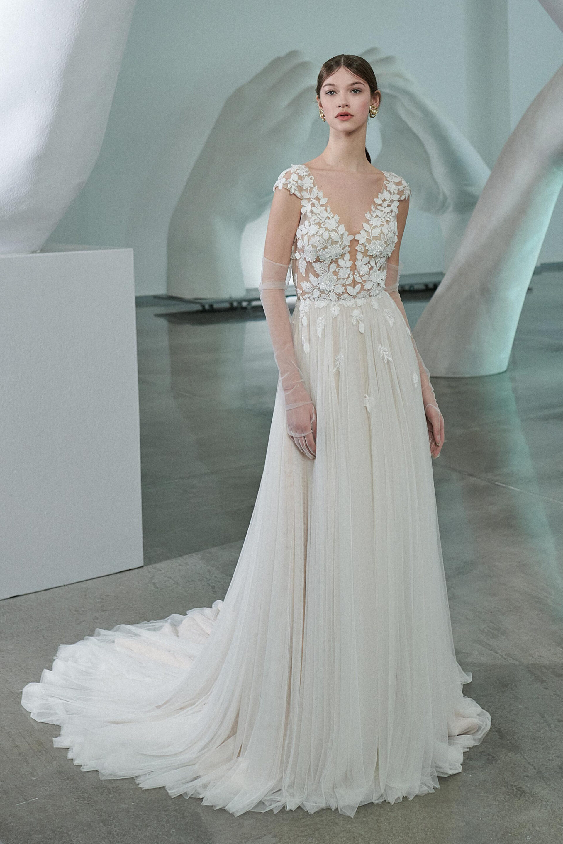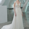 Leichtes Tüll Brautkleid mit Blätterspitze und angesetzten Ärmeln.
