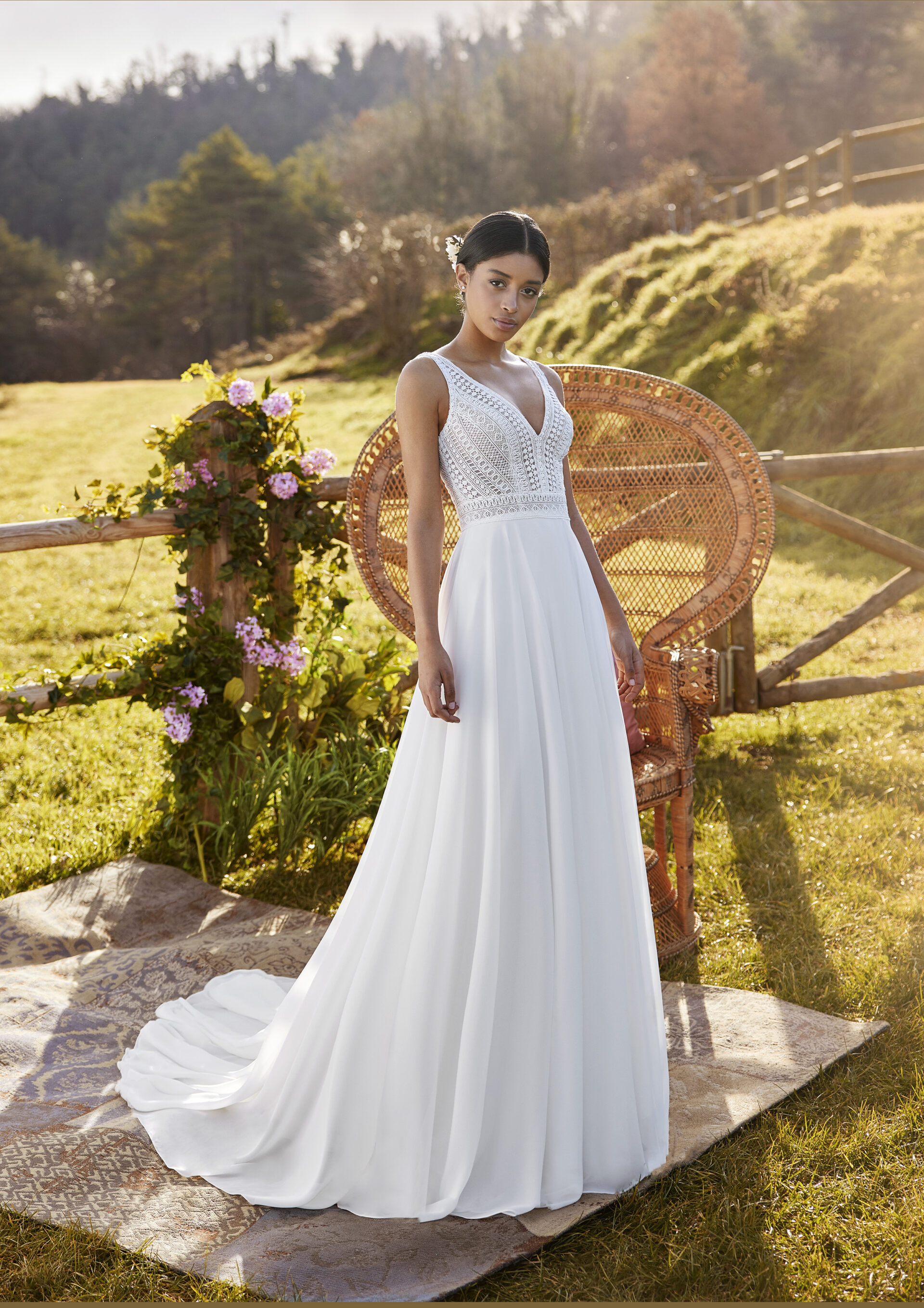 Fließendes Chiffon Kleid mit Diamant Förmigen Rückenausschnitt und geometrischer Spitze.